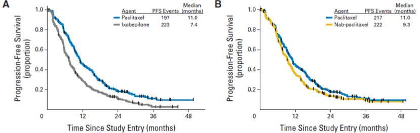 研究结果显示,紫杉醇组的中位无进展生存期(PFS)为11个月。事后分析表明,伊沙匹隆组的中位PFS为7.4个月,劣于紫杉醇组(HR=1.59,95%CI 1.31-1.93,p<0.0001)。白蛋白紫杉醇组的中位PFS也有劣于紫杉醇的趋势,为9.2个月,但P值未达到统计学显著差异(HR=1.20,95%CI 1.00-1.45,p=0.054)。
