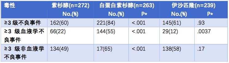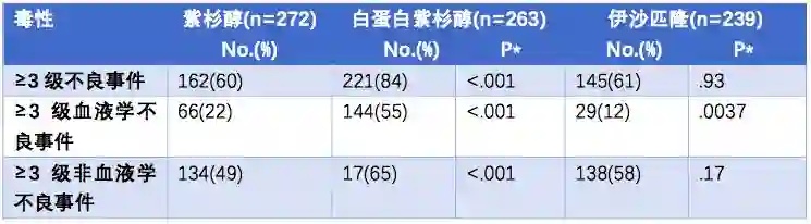 毒性方面,紫杉醇组、白蛋白紫杉醇组和伊沙匹隆组≥3级不良事件的发生率如下表。整体而言,与紫杉醇组相比,白蛋白紫杉醇组的血液学毒性和非血液学毒性更高。伊沙匹隆的血液学毒性发生率更低,非血液学毒性发生率略高。