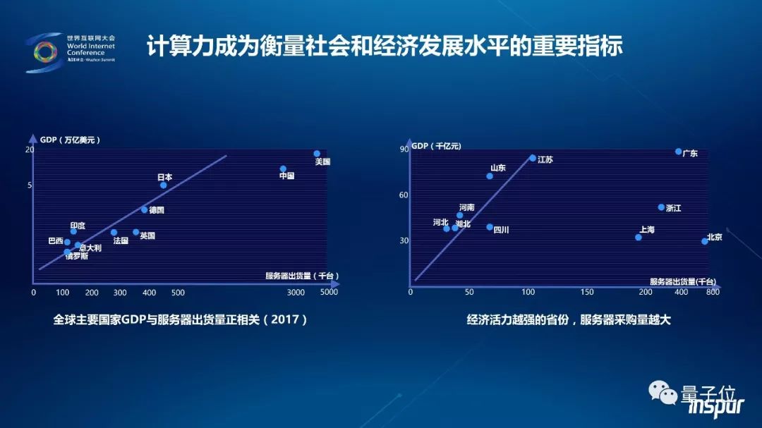 王恩东说,从技术上看,互联网对于经济的改变更多是计算对经济的改变,计算已经成为重要的社会生产力,成为衡量社会和经济发展水平的关键指标之一。首先,同一领域内,规模越大的公司服务器采购量就越大,例如,市值TOP7互联网公司也是服务器采购量的全球TOP7。其次,国家和地区的GDP规模与服务器出货量之间高度相关,甚至是线性相关,例如GDP与服务器出货量的前四位均为美国、中国、日本和德国。放眼国内,市场容量的地域分布与各省经济总量分布基本是正比例关系,上海、北京、浙江等发达地区每万亿GDP对应的服务器保有量远远高于全国平均水平。