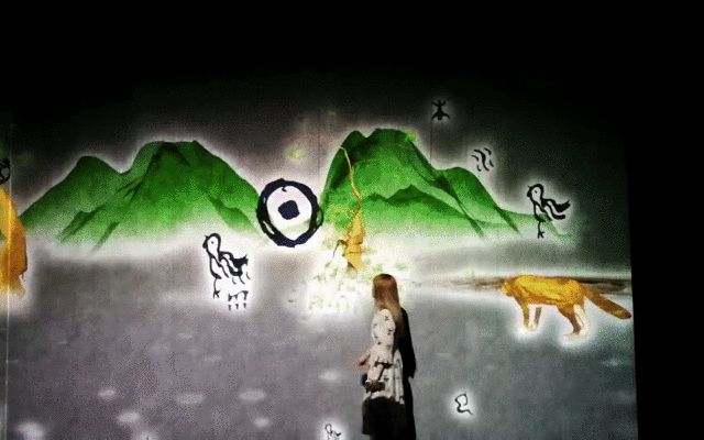 远古神灵,满屏幕飘着象形文字甲骨文:日、月、山、川、雨、象、鸟等,轻轻碰一下文字,就会幻化出相应的图像,而且动物能跑动、雨川会流动,越多人参与互动,画面越丰富。