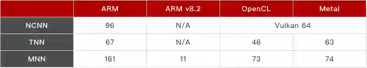 算子实现上,MNN在计算后端的支持也是最广的。除了ARM v8.2,MNN在GPU算子的支持上也远超于其他两个框架。