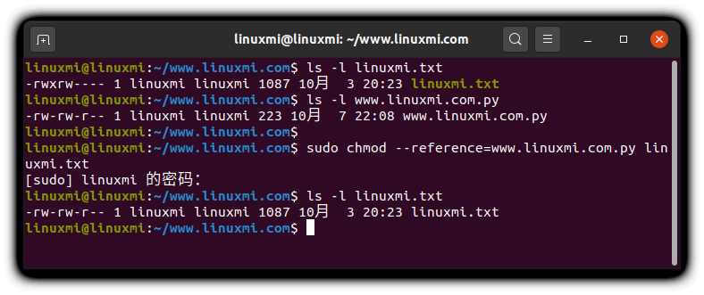 $ sudo chmod --reference=www.linuxmi.com.py linuxmi.txt