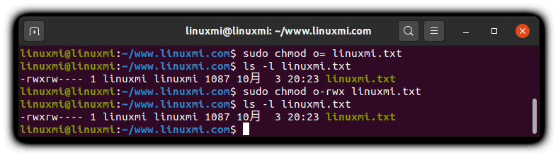 linuxmi@linuxmi:~/www.linuxmi.com$ sudo chmod o= linuxmi.txt