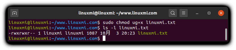 linuxmi@linuxmi:~/www.linuxmi.com$ sudo chmod ug+x linuxmi.txt