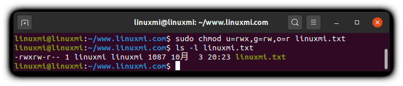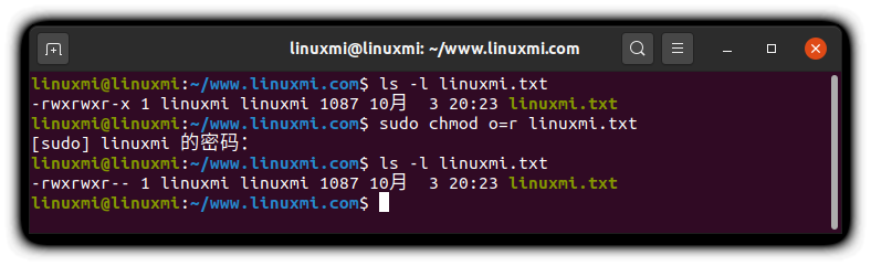 linuxmi@linuxmi:~/www.linuxmi.com$ sudo chmod o=r linuxmi.txt