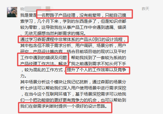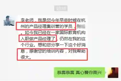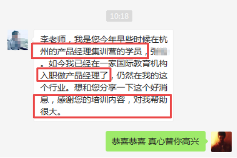 比如:产品实战营杭州站课程结束后,学员基于所学内容,顺利找到产品工作,仍然跟老师保持沟通交流。