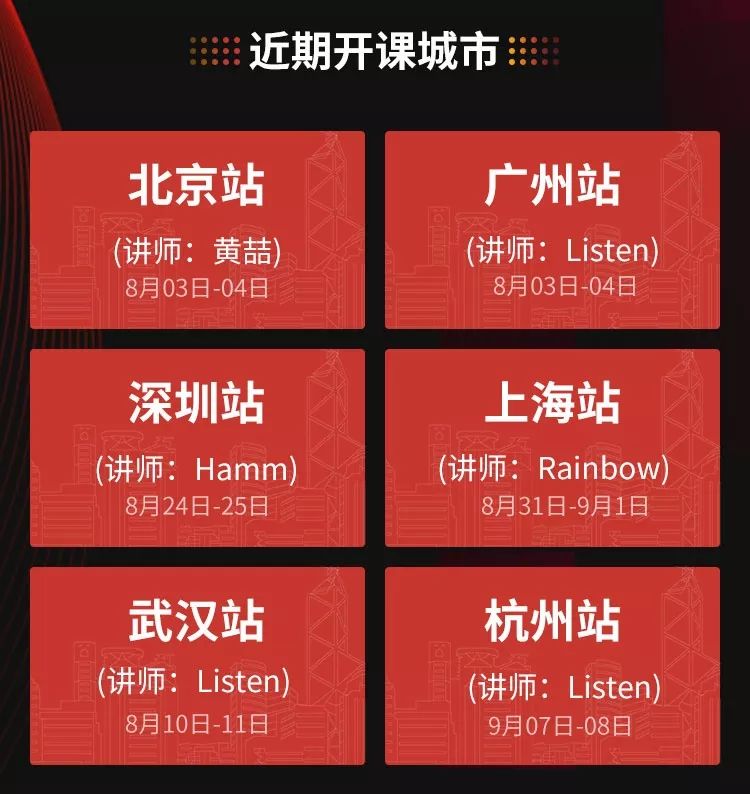 (8月3-4日)广州、北京而且我们的线下课程都是小班授课,为了保证大家的学习效果和质量,每一期报满就会关掉报名入口哦!
