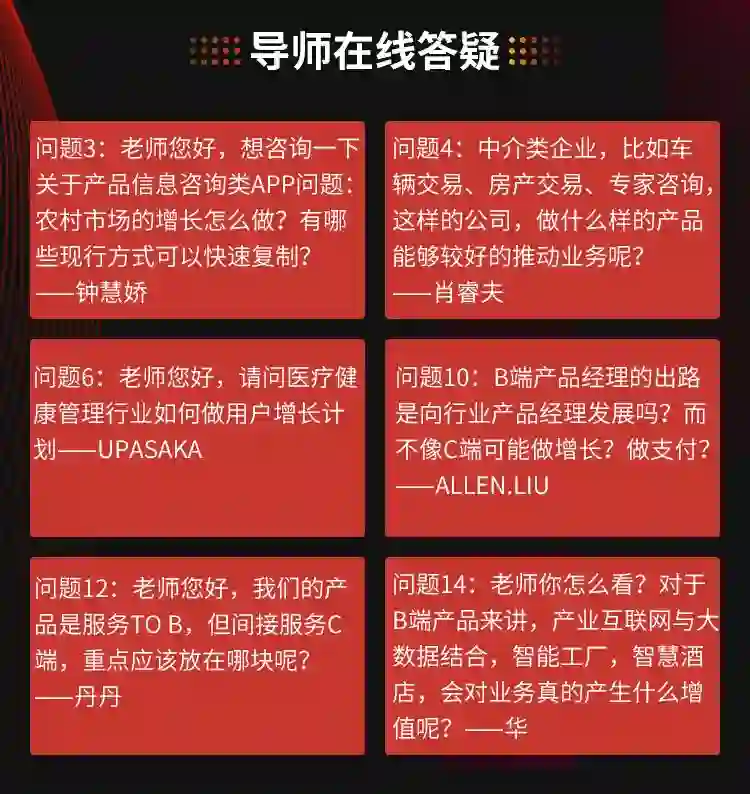除了大量的知识摄入以及练习以外,还有金牌导师在线直播答疑和文字答疑两种形式,现场直播帮你解决在产品学习和工作中遇到的难题。