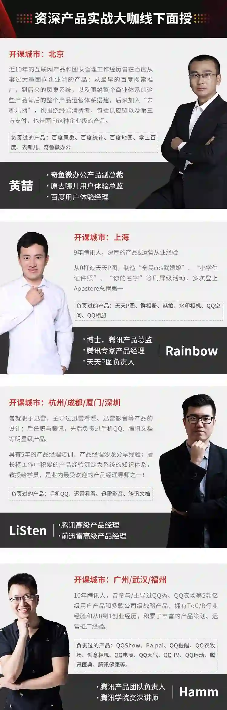这也是《产品经理实战训练营》最打动我的地方,老师们都是来自BAT等一线互联网公司的产品leader及以上级别,主导过3-5款知名产品,经历过上亿用户级别的大型产品项目。