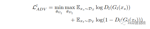 。在实践中,G和D之间通过梯度反向层(Gradient Reverse Layer, GRL)进行连接,梯度反向层可以逆转流过G的梯度。当训练过程收敛时,G倾向于提取域不变的特征表示。在形式上,第l-th卷积块中对抗性学习的目标可以表示为: