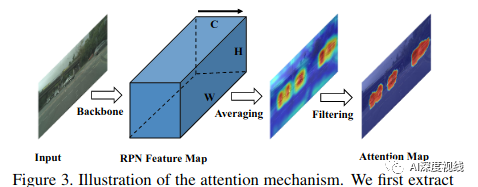 要使用检测任务对对目标进行本地化和分类,roi通常比背景更重要。然而,域分类器在没有聚焦的情况下对整个图像的所有空间位置进行对齐,这可能会降低自适应性能。为了解决这一问题,作者又提出了一个注意机制来实现前向感知的分布对齐,利用RPN中的高级特征来生成注意力地图,如图3所示。