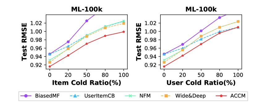 同时,为了应对冷启动用户的推荐问题,参赛团队还在模型训练过程中引入了 Cold-Sampling 机制,通过随机隐藏一定比例的 user/item id 特征向量,让对冷启动用户的推荐得到充分的学习。据了解,THUIR 在在线实验阶段,尝试了多种模型,包括基于 RNN 的推荐方案等,其中 ACCM 方法在评测中得到了最好的推荐效果。ACCM 模型在不同冷启动场景下面的实验结果如下图所示: