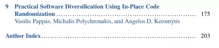 最后,在第九章,Pappas等人描述就地代码随机化,一种可以直接应用于第三方软件的软件多样化技术。它们演示了就地代码随机化如何强化固有易受攻击的 Windows 7 应用程序,并提供概率保护以防止面向返回的编程 (ROP) 攻击。