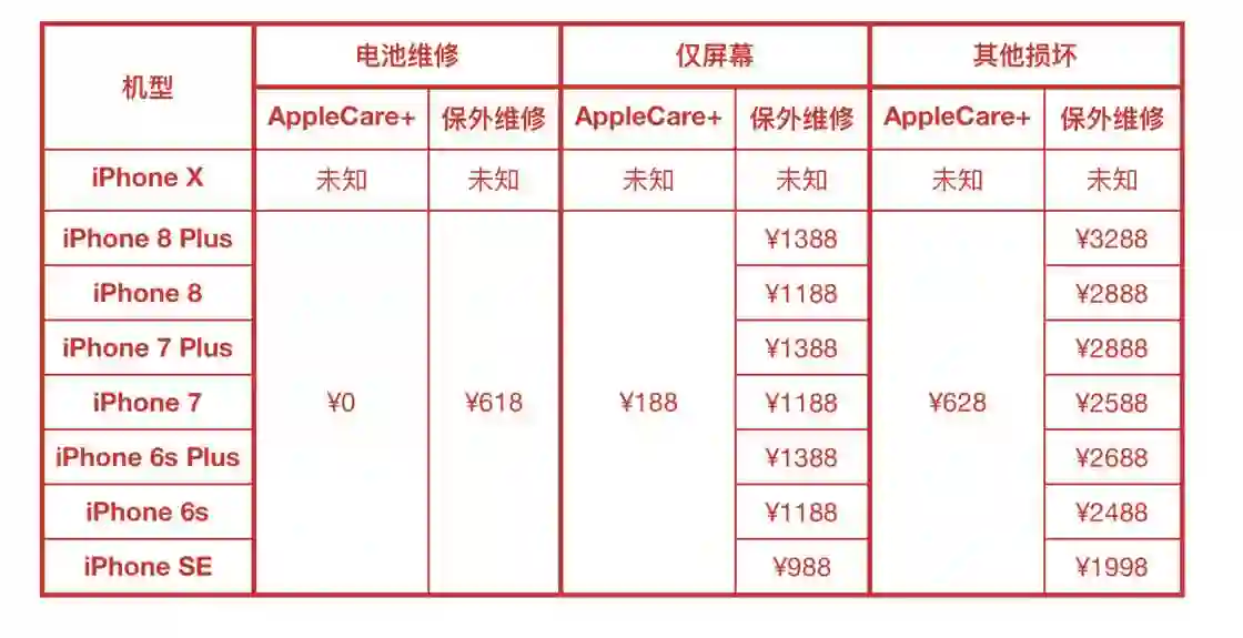 下表列示了截止 2017 年 9 月 26 日 Apple 官网在售 iPhone 的维修费用。当然,其他损坏也不是指所有损坏,对于摄像头、Home 键和玻璃后盖等不能进行单独更换的部件,都属于其他损坏,需要高额的保外维修费用;而像 SIM 卡托、听筒等则是可以进行单独更换的部件,它们的维修费用很低,不在下表列示的其他损坏保外维修范围,也不经过 AppleCare+ 维修。