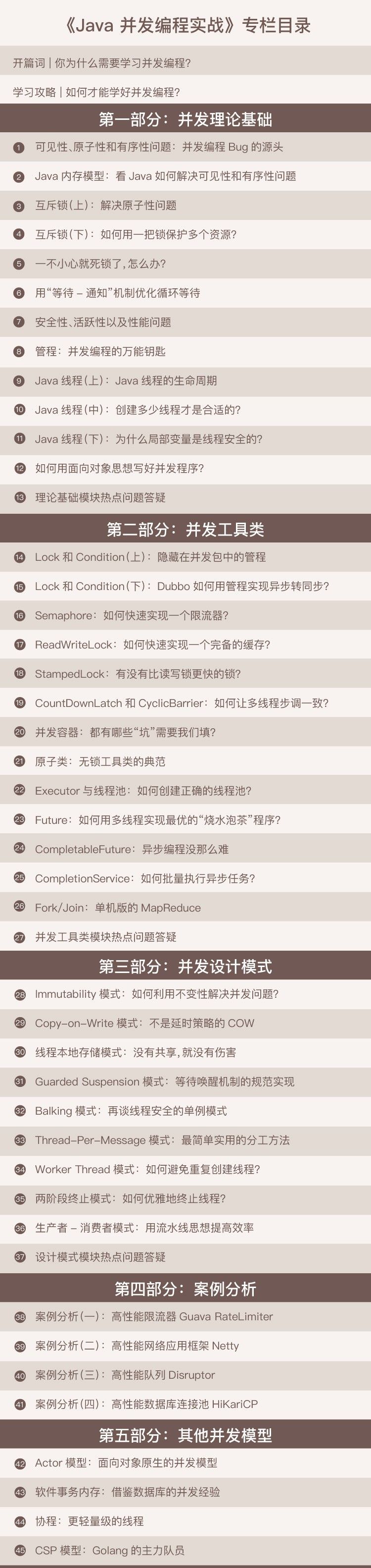 更值得关注的是,王宝令在极客时间开设了《Java并发编程实战》专栏,专栏中,会站在理论、模型的角度讲解Java并发,全面系统的并发编程知识体系,帮助大家得心应手地解决各种并发难题。