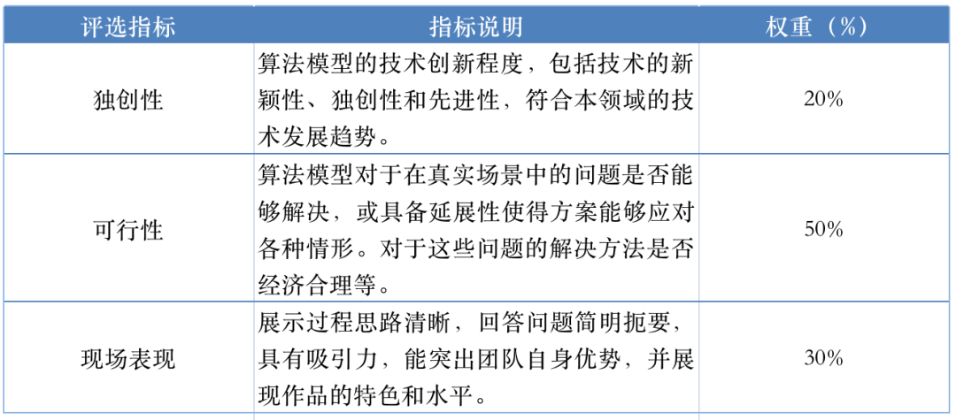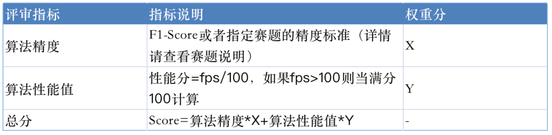 初赛评审规则:2大赛题最终得分采取准确率、算法性能绝对值综合得分的形式,2者的权重比例请查阅大赛指定赛题对应的【赛道说明】。