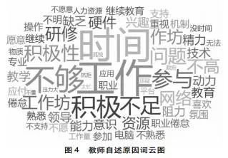 在开展数据测量和分析的同时,研究团队通过在线协作工具Padlet发布了以“您觉得远程培训中引发参训教师阻抗的因素有哪些”为主题的在线同步实时讨论,40位远程参训辅导教师参与讨论。教师们陈述引发阻抗的因素,以文字形式匿名发布在网上白板墙中。研究者将陈述内容整理后形成文字云(见图4)。可见,被提及最多的阻抗产生原因是时间和工作。
