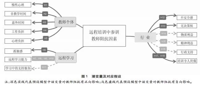 综合以上分析,本研究预设远程培训中教师阻抗产生的潜在原因来源于“教师职业”“教师个体”“远程学习”三个维度,具体表现为14个潜变量及相应假设(见图1)。