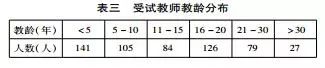 经过调整后的测试题于2016年12月14日至2017年1月20日期间,随进行中的远程培训项目发放并通过网络在线填答,共回收585份填答反馈。通过测试问卷最快填答所需时间为两分钟,时间少于两分钟的被视为无效数据,筛选后的有效问卷562份,有效率96%。参与在线填答的男教师164名,女教师398名;执教学科有语文、数学、英语和其他四类;工龄30年及以上的教师27名,其他教龄段教师人数都在79名以上,5年教龄以下的新教师占总人数的四分之一(见表三)。