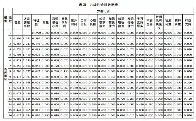 本研究对回收数据进行统计处理,对每个潜在变量对应测试数据多元线性回归中容差(Tolerance)、方差膨胀系数(VIF)、特征值以及方差比例等参数进行判断,所得数据的共线分析结果见表四。