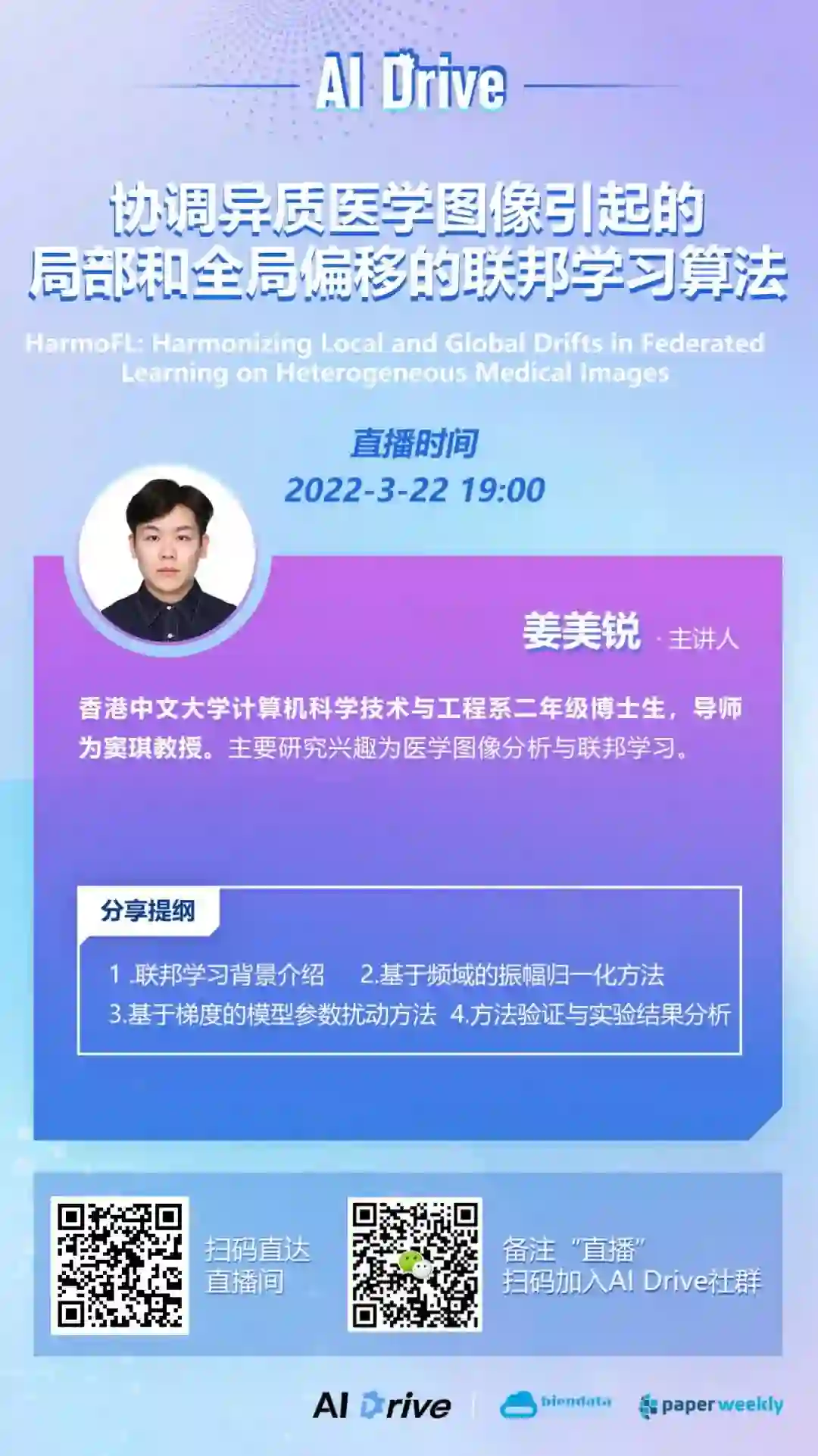 本期 AI Drive,我们邀请到香港中文大学博士生姜美锐,为大家在线解读其发表在 AAAI 2022 的最新研究成果:HarmoFL: Harmonizing Local and Global Drifts in Federated Learning on Heterogeneous Medical Images。对本期主题感兴趣的小伙伴,3 月 15 日(本周二)晚 7 点,我们准时相约 PaperWeekly 直播间。