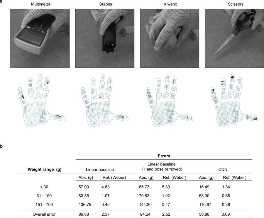 接下来,作者使用手套来拾取物体,并证明了类似的深度学习模型可以估计未知物体的重量。结果显示,重量在60克以内的物体大部分都能准确估计出来。