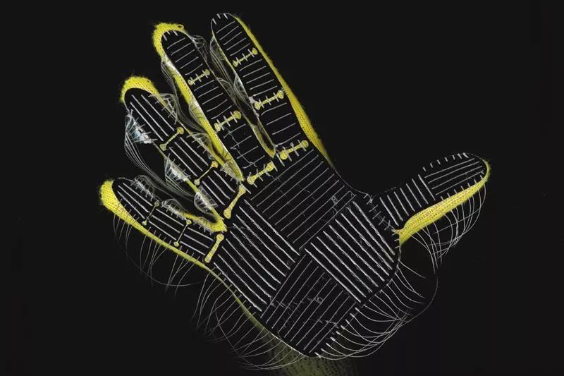 低成本的触觉手套,由一个普通针织手套(黄色)和一个手形的传感器套(黑色)组成。