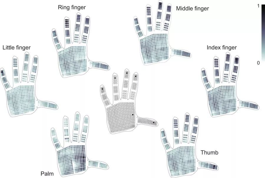 最后,Sundaram和他的同事通过观察信号相关性分析了不同手部区域在抓取物体时的协作。