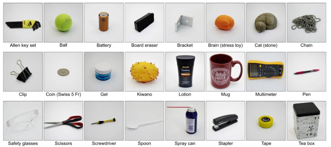 实验总共使用了 26 个物品;这里显示了 24 个,此外还有两个可乐罐(一个空罐和一个满罐)。