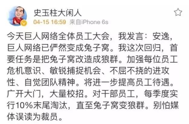 大概2年前吧,巨人网络的史玉柱前辈折腾了一出戏:向马爸爸取经,要搞狼性文化,恁死团队里的兔子。落地的政策也是很传统——末位淘汰。