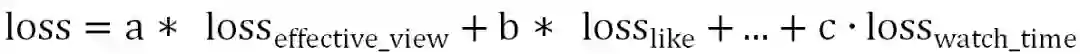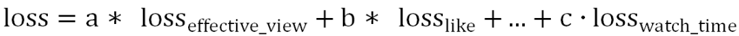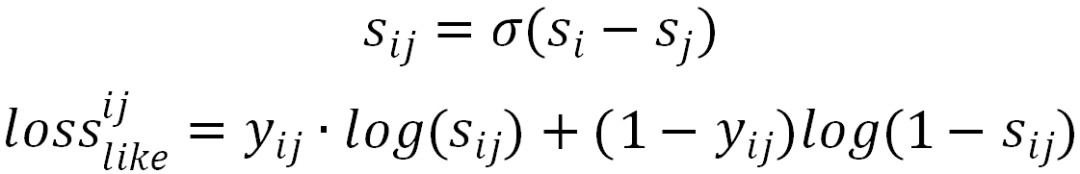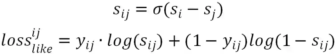 ② 对于Pairwise形式,在一次用户请求返回的6个视频之间,对每种目标都如下操作:先通过该目标的正样本和负样本构造偏序对,再使用DNN网络学习偏序对的打分,对打分做sigmoid变换,最后通过交叉熵损失产出loss。下述公式表示的是like目标: