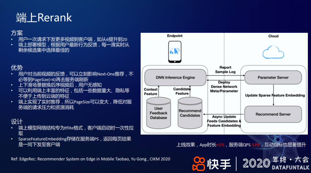 在端上做Rerank的具体方案是一次用户请求下发更多视频到客户端,比如从一刷下发6个提升到20个;在端上部署一个轻量的模型,根据用户对每一个视频的最新反馈实时调整,每一滑实时从候选集中选择最佳的视频。端上Rerank的优势有如下几方面: