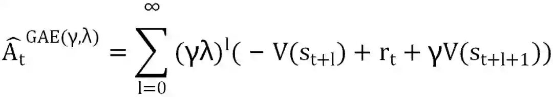 其中Aπ(st,at)是Advantage函数。进一步,使用GAE降低偏差,通过reward和状态值函数组合得到GAE: