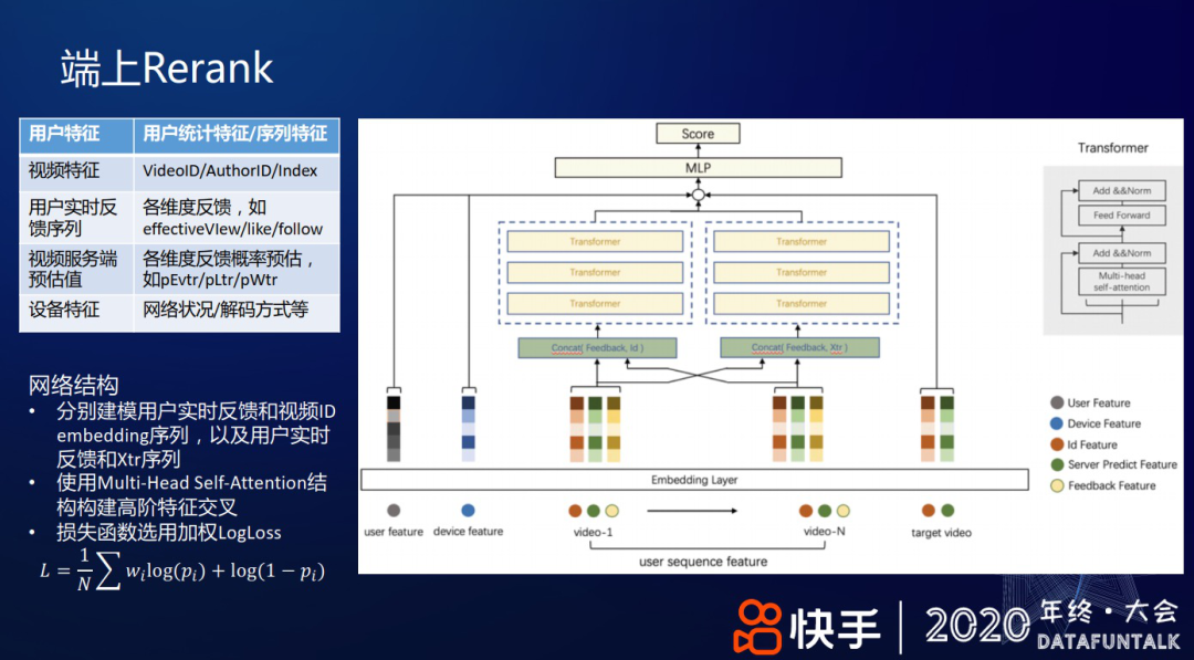 网络结构如上图右侧所示,通过两个transformer结构分别建模用户实时反馈和视频ID embedding序列、用户实时反馈和Xtr序列;使用Multi-Head Self-Attention结构构建高阶特征交叉;损失函数选用加权LogLoss: