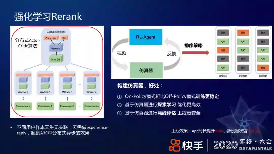 具体训练时,没做experience-reply,因为不同用户的样本间天然没关联,所以不需要额外的去关联。而是使用一个仿真器帮助训练,好处是使用仿真器做探索学习效率更高,基于仿真器做离线学习,再上线会更安全,使用On-Policy相比Off-Policy训练会更稳定。上图右侧给出了一个排序策略作用后,不同的模式样例:离线日志有用户快速划过、播放、播放后的点赞行为,通过一个较好的策略能把好模式排在前面。