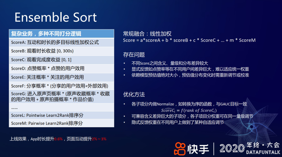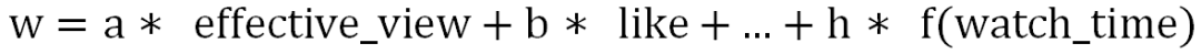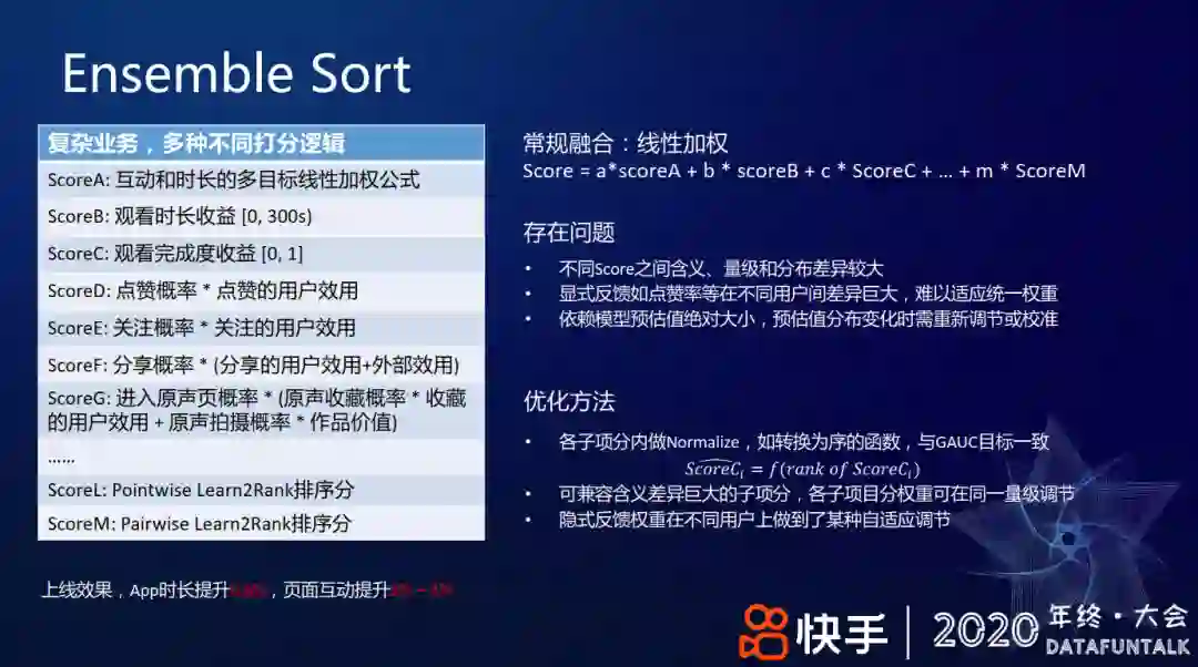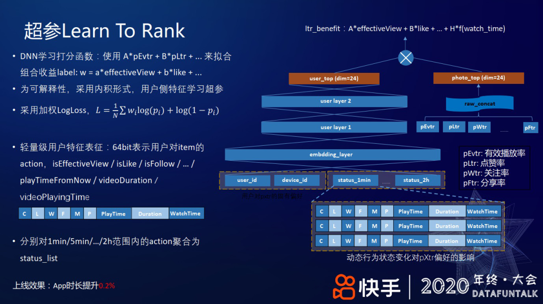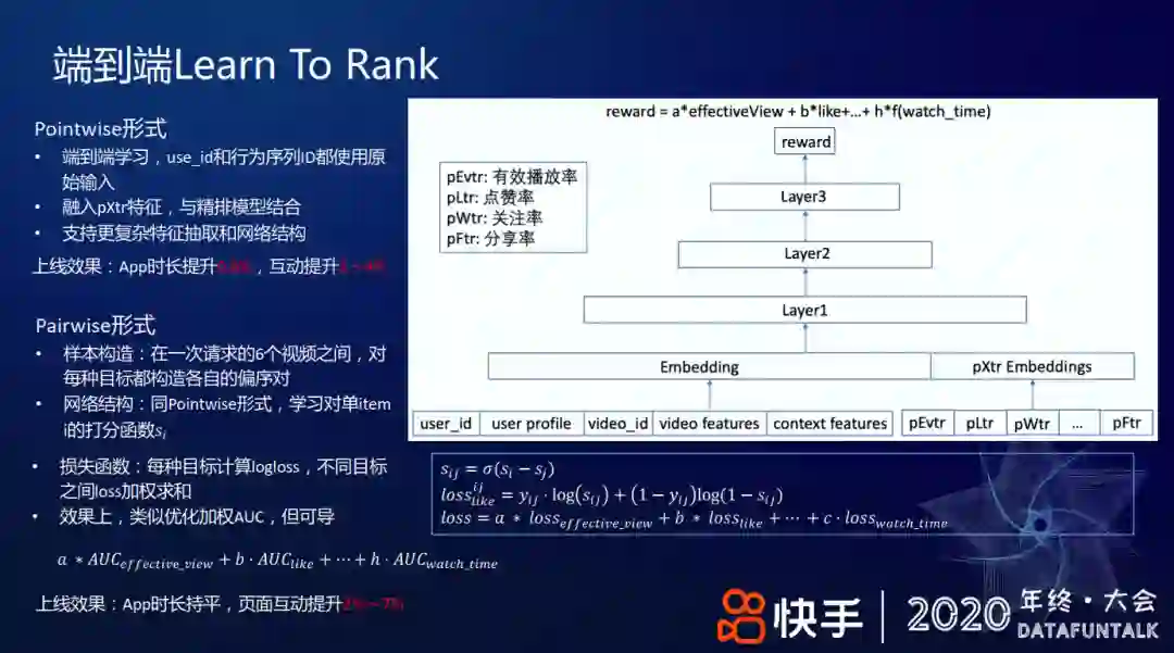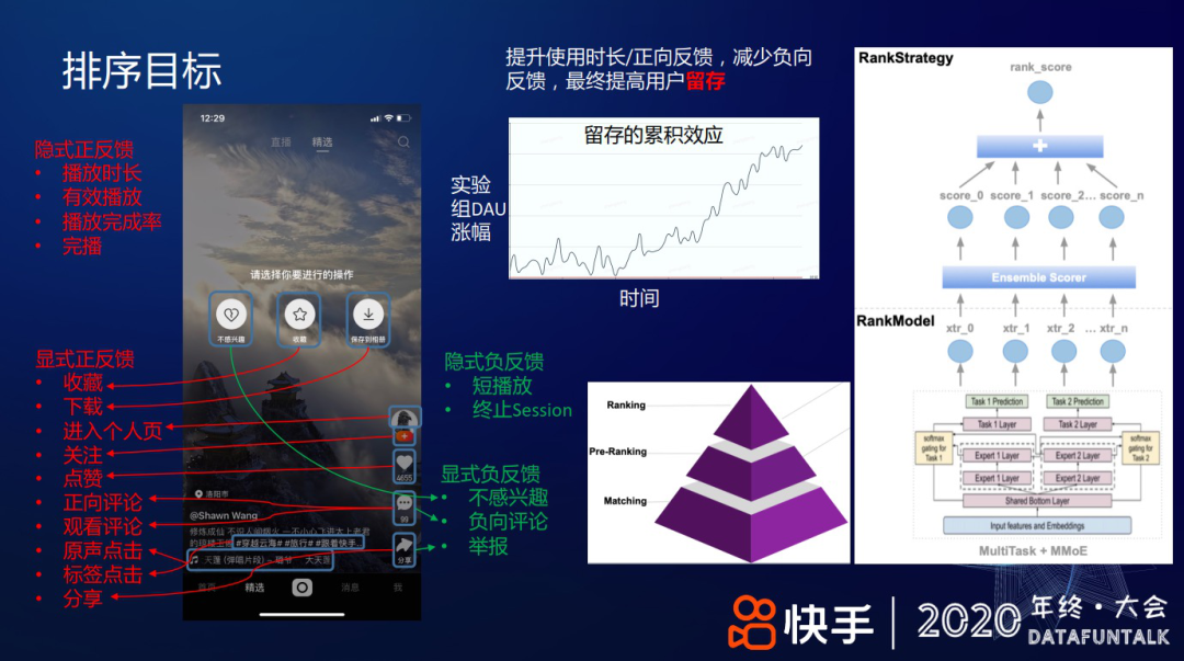 在上图左侧表格中给出了一些复杂目标,包括用户的互动和时长的多目标线性加权公式,还有分享后带来的外部效用和用户本身分享效用,其中,外部效用包括用户在外部社交网络传播对快手DAU的贡献等等。