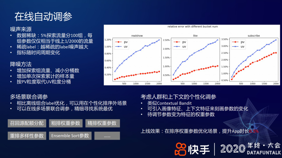 在实践中,困扰比较多的是噪声。噪声主要来源是数据稀缺和稀疏label。比如把5%的流量分100组,相当于十万量级的用户几小时的样本量只能生成一个样本点,并且每组参数只相当于线下1/2000的流量,这么小的流量做AB测试方差会比较大。上图右侧展示了“随着分组数的增加,不同互动类型的波动”,如播放量波动范围0.4~1.2%,点赞量的波动会更大一些,因为稀数label的波动性可能会更大一些。