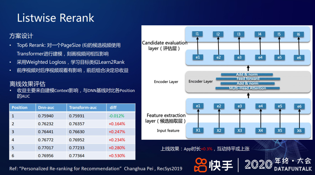 首先,采用类似Learn2Rank的学习方案:对精排层返回的Top6视频做Rerank,使用transformer进行建模,刻画视频间相互影响:把6个视频做特征抽取后,经过transformer层的encoder得到embedding表示,再经过评估层得到输出,损失函数采用Weighted Logloss。实践中,前序视频对后序视频的播放和效用有影响,比如在上下滑场景,看了前面的视频可能会对后面的视频有影响,但看了后面的视频不会对前面的视频有影响。但作为一个组合收益,需要前后组合决定总收益。比如把五个爱看的视频和五个不太爱看的视频放在一起,如果前五个全是爱看的,而后面五个全是不爱看的,可能用户翻到第七个视频时,就会退出;但如果把爱看和不爱看的夹杂着放,有可能用户能看完十个视频,可能还会从之前五个不爱看的视频里探索出一个新的兴趣,即这种组合的收益会有更大的提升空间。