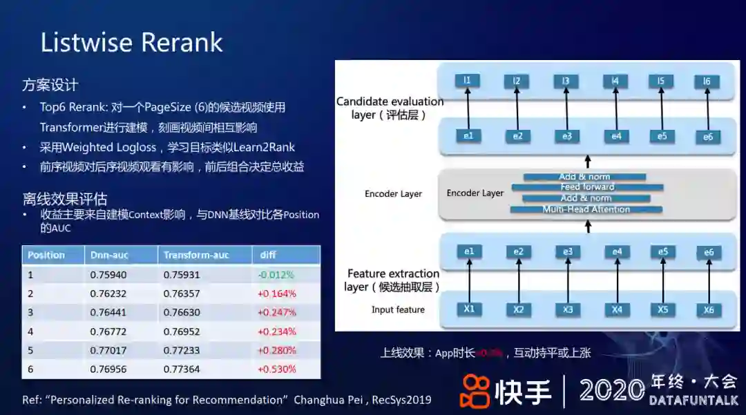 对于离线效果评估,我们对比统计了“做transformer后推荐结果的AUC”和“DNN基线,即精排模型给出排序结果的AUC”,从上图左下角表格可见:在不同位次上,从第1位到第6位,随着位次增加 AUC逐渐提升。即考虑前序视频对后序视频的影响,能改善后序视频的推荐体验。