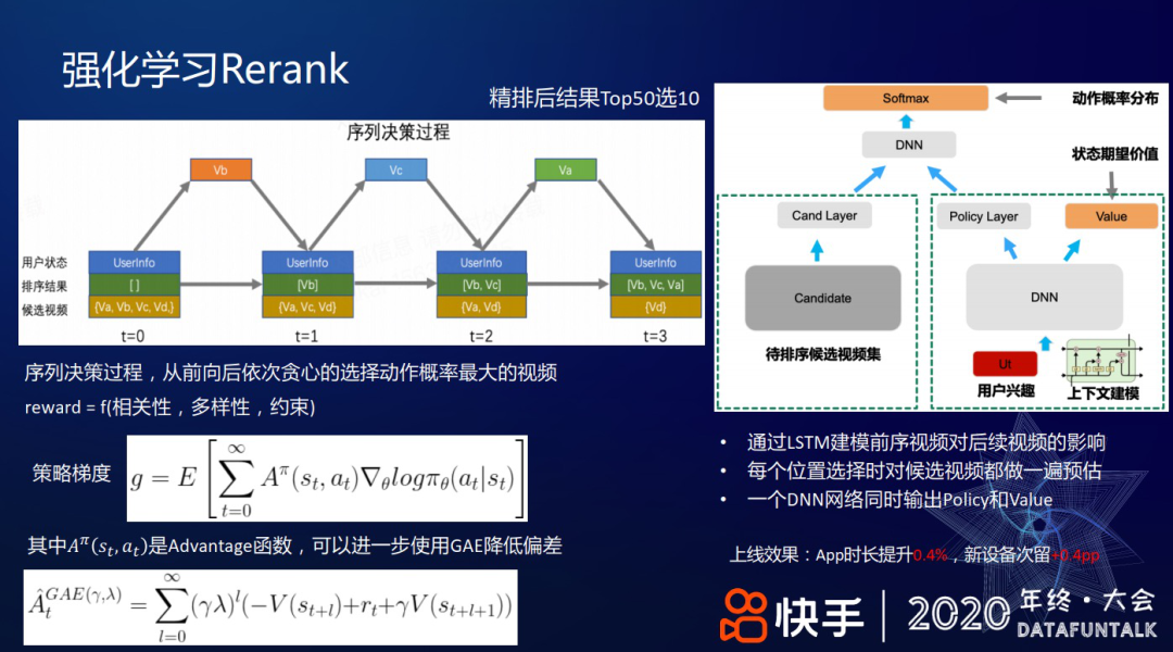 根据序列决策的思想,上图右侧给了一个LSTM网络结构来建模前序视频对后序视频的影响。DNN网络同时输出Policy和状态值函数Value,这里Policy是通过Softmax计算选择每个候选视频(Action)的概率后,选择概率最大的视频。Policy具体实现上,在挑选每个位置的视频时,把前序视频的作用编码成一个embedding向量,对候选集的每个视频做预估和softmax变换,最后会选择最大的。