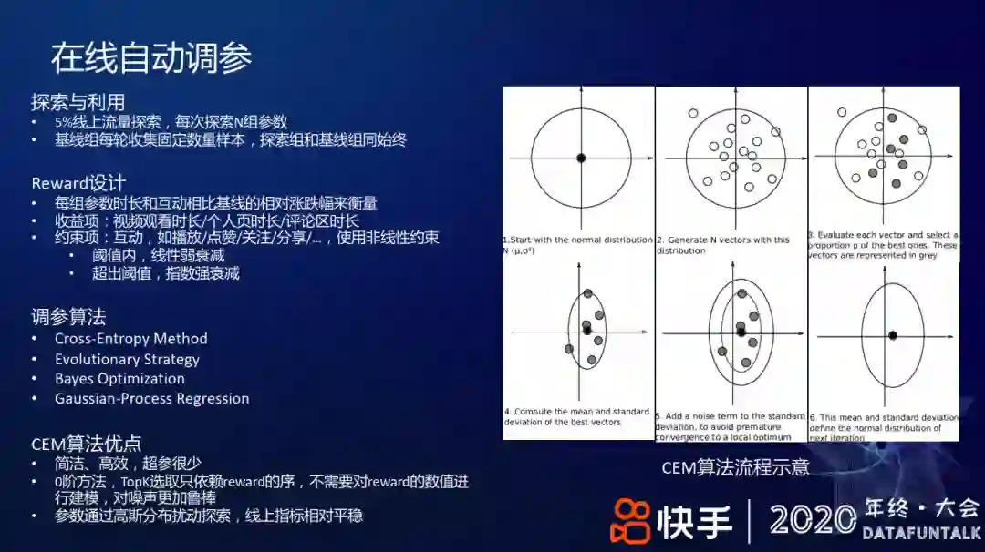 调参算法主要开发了离线优化使用的各种超参优方法,包括交叉熵算法(Cross-Entropy Method,CEM)、进化策略(Evolutionary Strategy,ES)、贝叶斯优化(Bayes Optimization)、高斯过程回归(Gaussian-Process Regression,GPR)。这里,主要介绍下实践中常用的CEM算法,右侧图例给出了该算法的工作流程:从参数初始的高斯分布出发,一般均值选为线上基线参数,方差手动设置,然后根据该高斯分布随机生成N组参数,每组参数都做在线AB测试、收集反馈、计算Reward,选择Reward最好的TopK组参数,并统计着K组参数的均值和方差,并对方差做微小扰动(防止过早陷入局部最优)后得到新的高斯分布,根据新高斯分布继续采样获取新样本...经过若干次迭代,最终会收敛到一组较好的参数。该算法的优点是简洁、高效,超参很少;0阶方法,TopK选取只依赖Reward的序,不需要对Reward的数值大小进行建模,对噪声更近鲁棒;参数通过高斯分布扰动探索,偏离基线越多的参数选中的概率越小,线上指标相对平稳。
