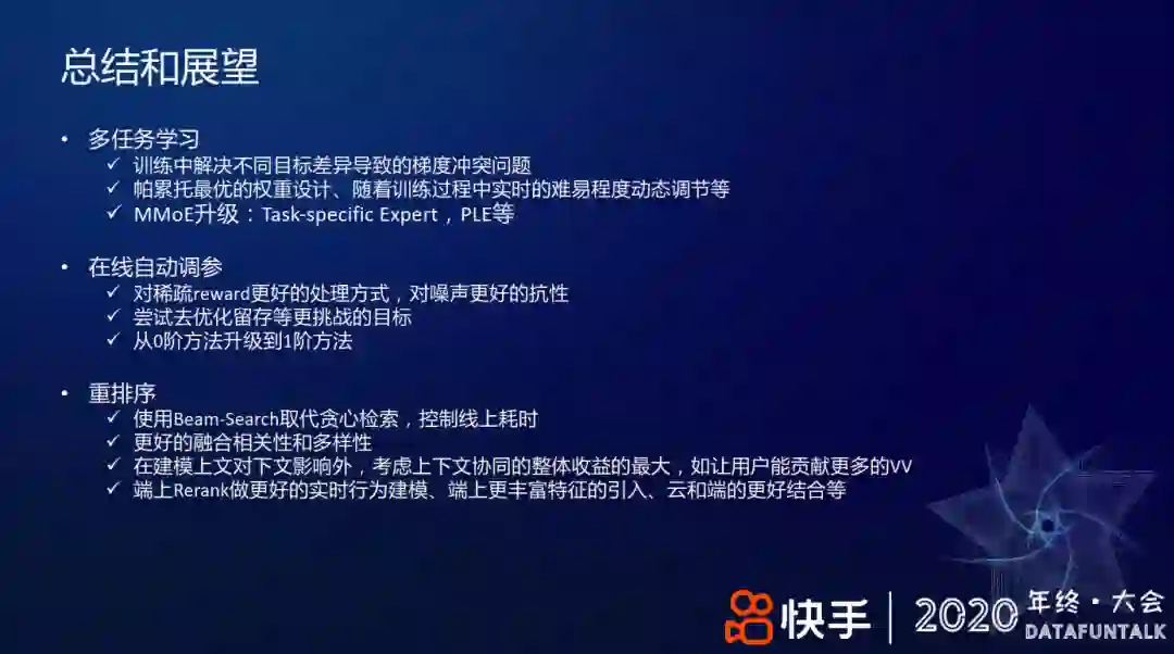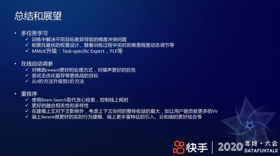 以上介绍了快手在多目标排序方面的部分工作,接下来给一个总结和展望,包括粗精排阶段的多目标排序、在线自动调参和重排序几方面。