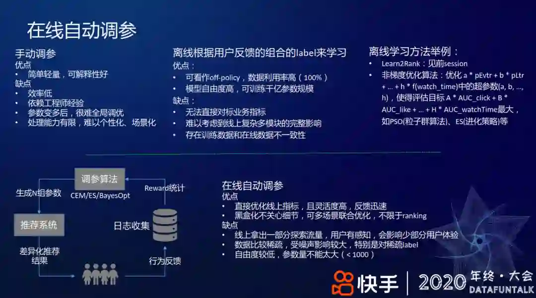 缺点是需要线上拿出一部分流量做探索,用户有感知,会影响少部分用户体验;每组几万或几十万的用户 积累几个小时的数据,只能产生一个样本点,由此数据较稀疏,受噪声的影响较大,特别是一些稀疏的label,如分享、下载、收藏等 稀疏label;能容纳的参数量较小,一般几十到数百,相对离线学习的参数规模小很多。