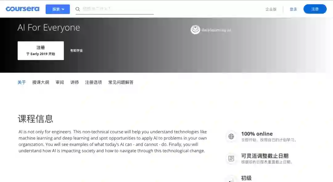 deeplearning.ai 与其说是一家创业公司,倒不如说是吴恩达在线 AI 教育平台 Coursera 的一个分支,吴恩达之前推出的“AI for everyone”课程就发布在这个网站。