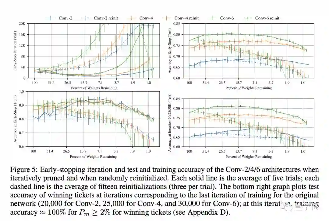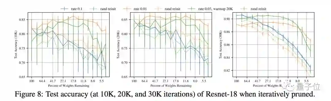 密集、随机初始化的前馈神经网络包含一些子网络,也就是中奖号码,当对其单独进行训练时,这些子网络能够在相似迭代次数中达到与原始网络比肩的准确率。