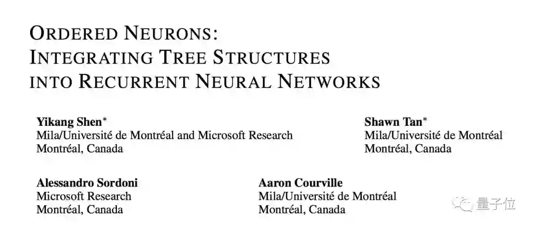 Ordered Neurons: Integrating Tree Structures into Recurrent Neural Networks,翻译过来就是《有序神经元:将树结构集成到循环神经网络》。