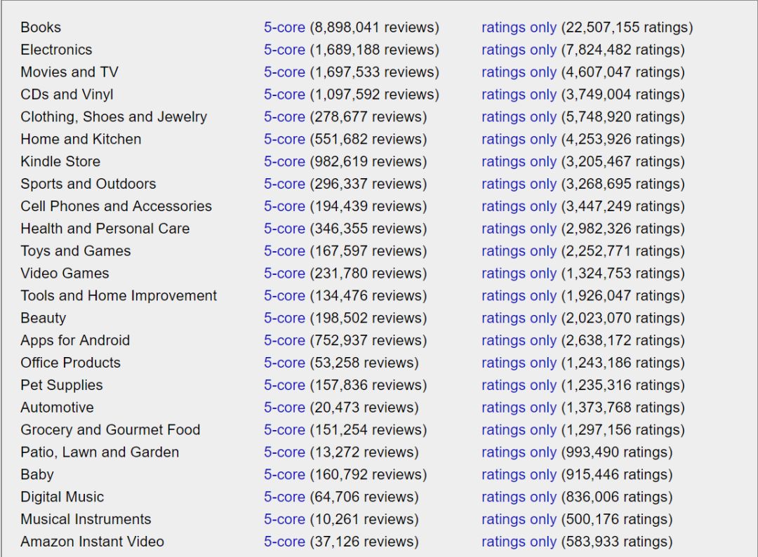 该数据集包括自1996年5月至2014年7月,来自Amazon上的1.428亿产品的评论和metadata。