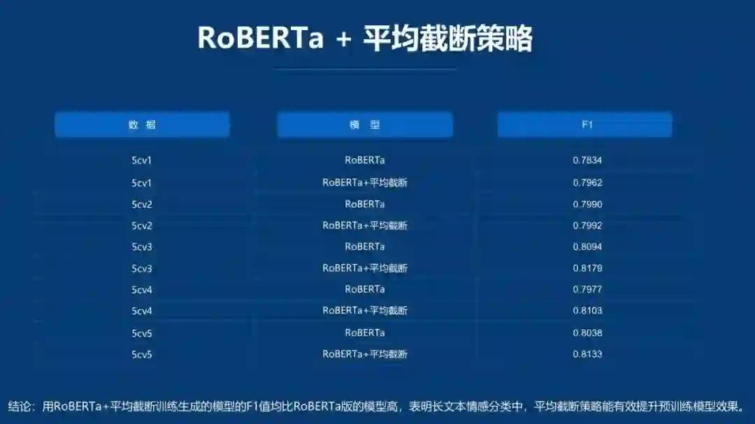 上图是百分点对标注数据集进行 5 折划分,通过交叉验证平均截断策略的效果。实验结果表明,用 RoBERTa+ 平均截断训练生成的模型的 F1 值均比 RoBERTa 版的模型高,表明长文本情感分类中,平均截断策略能有效提升预训练模型效果。