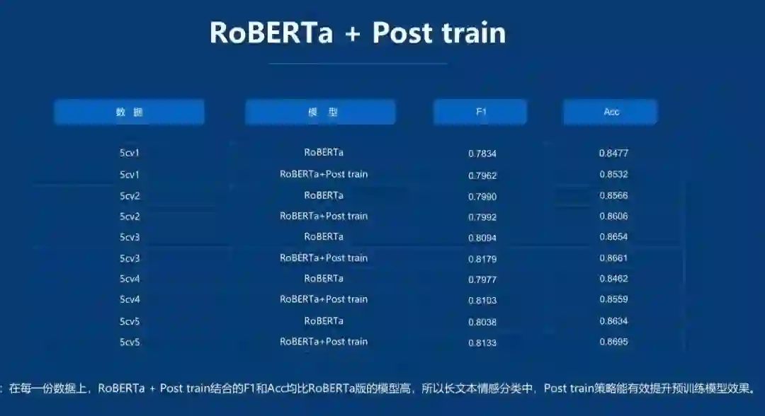 另外,百分点还采用了 post train 的方法提升模型的效果,实验结果证明,在每一份数据上,RoBERTa+ Post train 结合的 F1 和 Acc 均比 RoBERTa 版的模型高,所以在长文本情感分类中,Post train 策略能有效提升预训练模型效果。