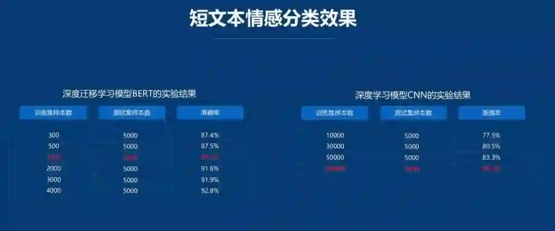 在 BERT 出现之前,团队已经意识到 CNN 模型存在的问题。苏海波补充道,这种模式对标注数据的依赖太大,一个简单的情感分类需要上万条,甚至十几万条标注数据,工作量太大,且实验过程中发现很多场景下根本无法提供这么多标注数据。对比之下,深度迁移学习可以大大降低标注数据量,通过预训练模型和大规模通用性语料,在不需要大量标注数据的情况下就可以得到不错的效果,这是一个革命性创新。